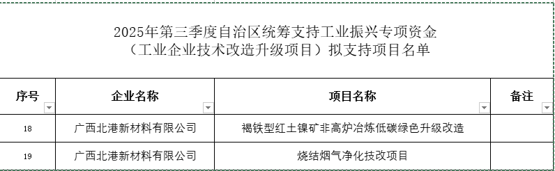 據顯示,廣西北港新材料有限公司褐鐵型紅土鎳礦非高爐冶煉低碳綠色升級改造、燒結煙氣凈化技改項目均入選此名單中。