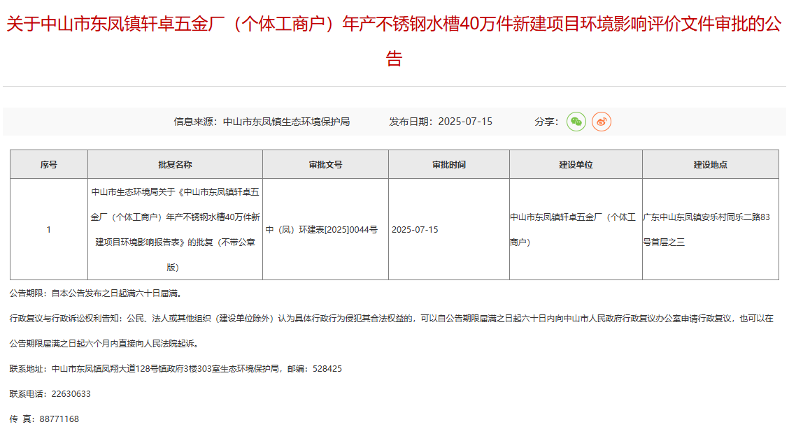 中山東鳳鎮(zhèn)軒卓五金廠年產(chǎn)40萬件不銹鋼水槽新建項(xiàng)目環(huán)評(píng)獲審批公告