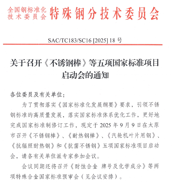 2025年9月9日,《不銹鋼棒》、《耐熱鋼棒》、《汽輪機葉片用鋼》、《抗輻照耐熱鋼》和《抗菌不銹鋼》五項國家標(biāo)準(zhǔn)項目啟動會將于太原市召開。