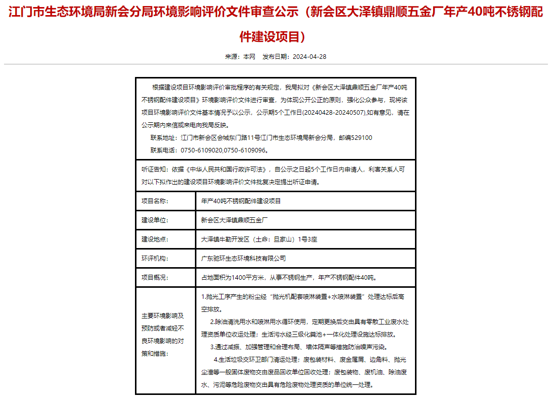 4月28日,江門(mén)市生態(tài)環(huán)境局新會(huì)分局就新會(huì)區(qū)大澤鎮(zhèn)鼎順五金廠(chǎng)年產(chǎn)40噸不銹鋼配件建設(shè)項(xiàng)目環(huán)境影響評(píng)價(jià)文件進(jìn)行審查公示,公示期5個(gè)工作日(20240428-20240507)。