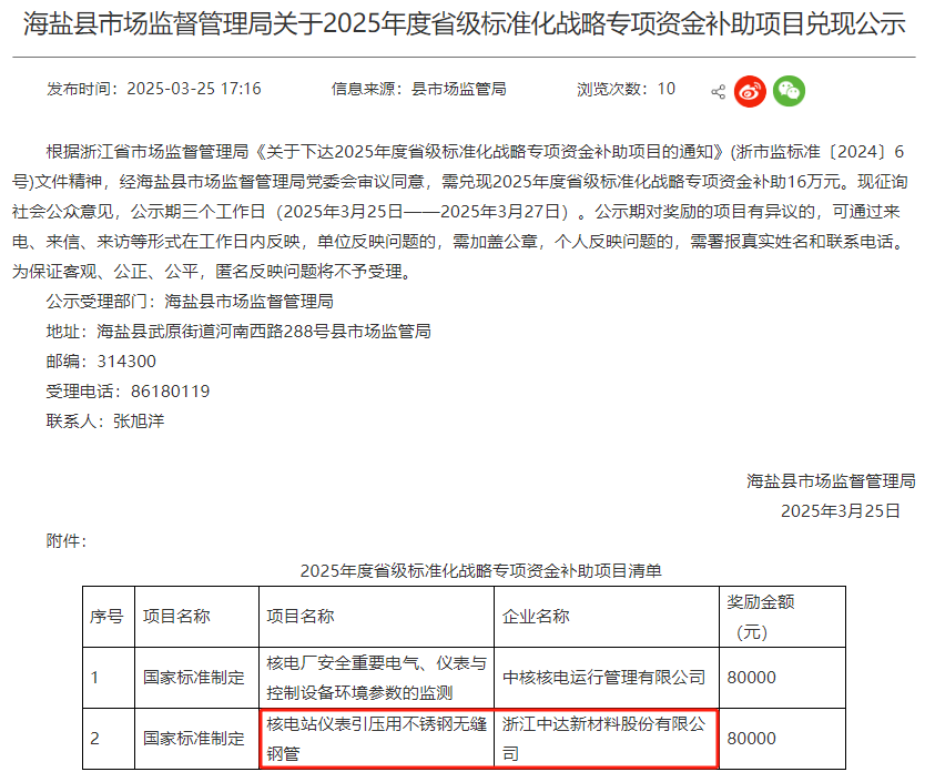 據(jù)顯示,浙江中達(dá)新材料股份有限公司核電站儀表引壓用不銹鋼無縫鋼管項(xiàng)目獲獎勵金額80000元。