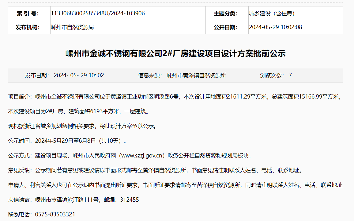 5月29日,嵊州市黃澤鎮自然資源所就嵊州市金誠不銹鋼有限公司2#廠房建設項目設計方案對外進行批前公示,公示時間:2024年5月29日至6月8日(共10天)。