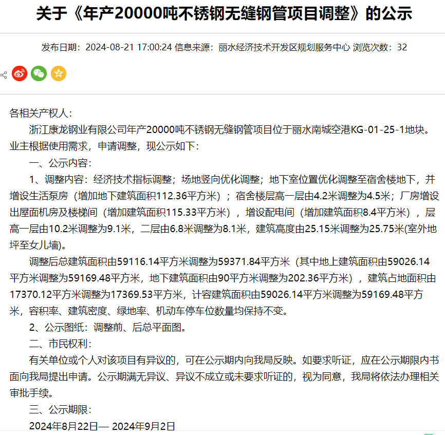 8月22日,浙江康龍鋼業(yè)有限公司年產(chǎn)20000噸不銹鋼無縫鋼管項(xiàng)目調(diào)整公示,公示期:2024年8月22日-2024年9月2日。